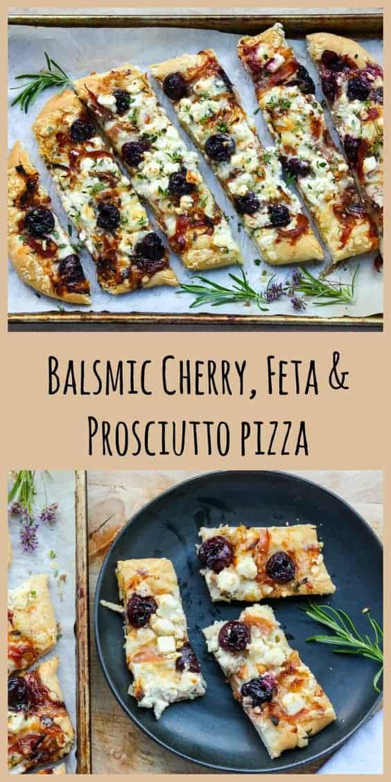 If you want to save time you can use a pre-made pizza crust, but homemade pizza dough is a cinch to make and to me, a homemade crust always takes pizza to the next level. If you like to use a bread maker for your dough, this recipe with beer is really good. This balsamic cherry, feta & prosciutto pizza would also be good on a naan bread crust, just like this Chicken Tikka Masala Pizza