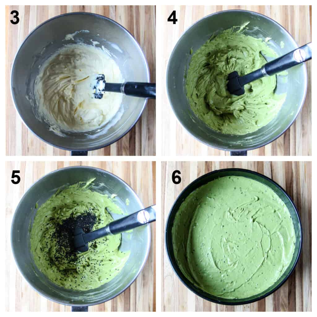 - In the bowl of a stand mixer or with an electric beater, (or a food processor) combine cream cheese, eggs, and sugar and beat until smooth. Add vinegar, vanilla, and matcha powder and beat until combined.