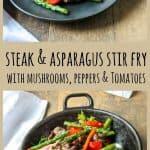 Steak and Asparagus stir-fry is a quick and delicious weeknight dinner and a great way to extend a steak. Mushrooms and red peppers are tasty additions and a delicious sesame ginger sauce completes it all.